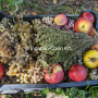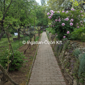 felső: szőlősorok, gyümölcsfák, két kapus 2 autónak helyet biztosító garázzsal, térkővel kirakott sétánnyal, mely a kert kapujától a házig vezet.